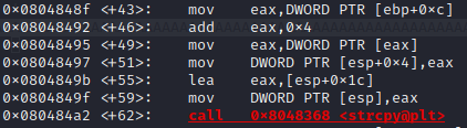 해당 함수를 보면 argv[1]의 주소인 esp+0xc를 strcpy에 저장될 변수인 0x1c에 주소를 저장하게 된다.