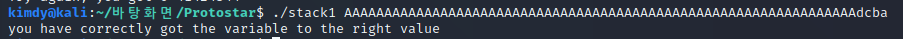 해당 문제는 argument를 사용하여 값을 입력 받는다. ex) ./stack1 AAAA