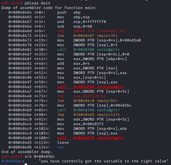 그러므로 argument의 주소를 확인해보면 main+71에서 eax와 ABCD를 검증하는 것을 확인할 수 있는데, 이때, eax는 esp+0x5c이 되므로 esp+0x5c의 값을 abcd로 바꾸어야 한다.