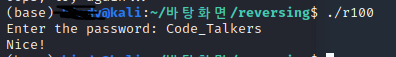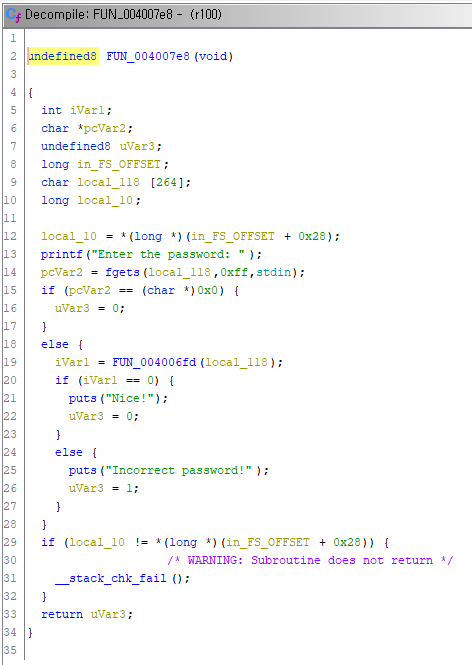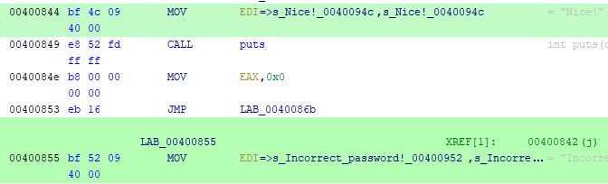 그 결과, 비밀번호를 입력받아 맞으면 Nice!를 틀리면 Incorrect password를 출력하는 것을 볼 수 있었다.