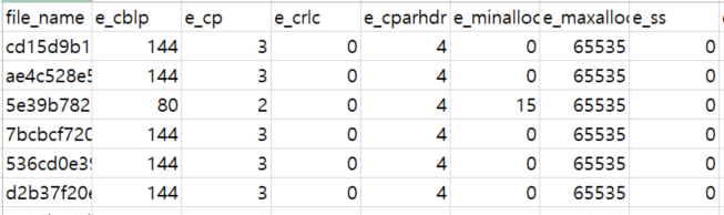 악성코드를 csv 형태로 추출하였지만 아래의 사진과 같이 각각 feature의 값이 어떤 feature의 값인지를 알려주는 pe 헤더가 누락되어있어, 이를 추가하는 코드를 짰다.